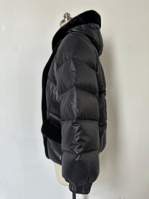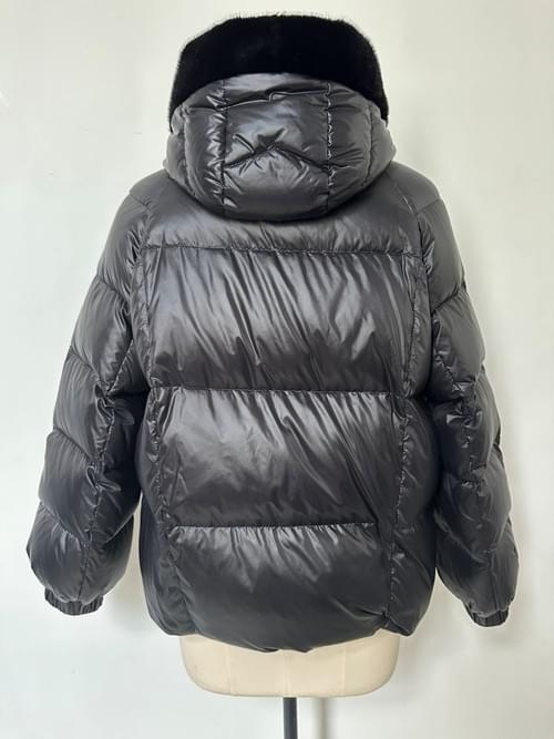 This down jacket features a plush faux fur trim paired with a glossy polyester outer shell, creating a warm, stylish, and modern winter look. Designed with a hooded silhouette, full front zipper, and soft fur-lined panels, it offers both practicality and a touch of luxury—perfect for cold-weather wear.