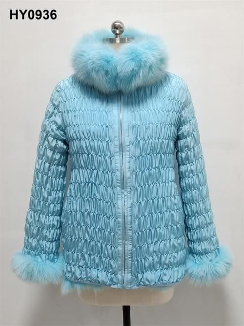 Elegant winter coat made of genuine fox fur, featuring a zipper closure, turn-down collar, and stylish urban look. Soft, warm, and suitable for various occasions.