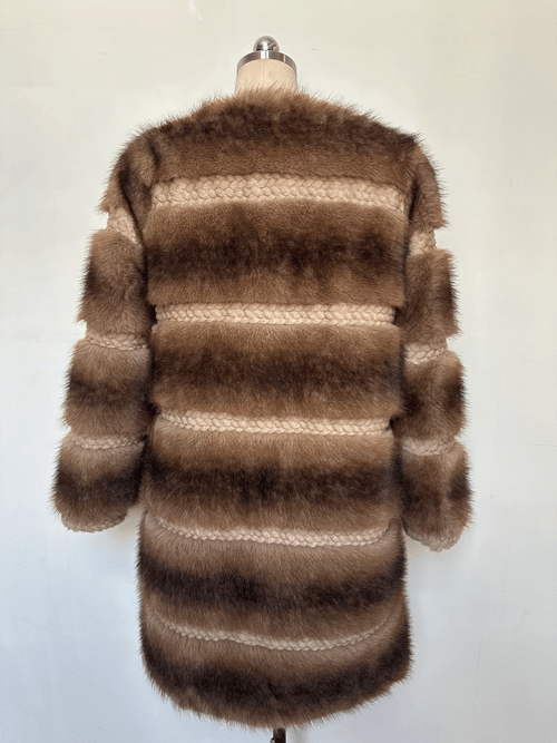 Trendy short-length faux fur coat with a striped gradient design in soft brown tones. Crafted from high-quality faux fur for a plush texture and warmth. The collarless cut and slim silhouette create a chic and modern look, perfect for pairing with jeans or skirts for autumn and winter outfits.