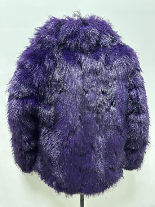 Elegant faux fur coat in a rich purple hue, designed with a turn-down collar and long sleeves. The soft and voluminous texture provides warmth and a luxurious appearance, making it perfect for both casual outings and chic urban looks during autumn and winter.