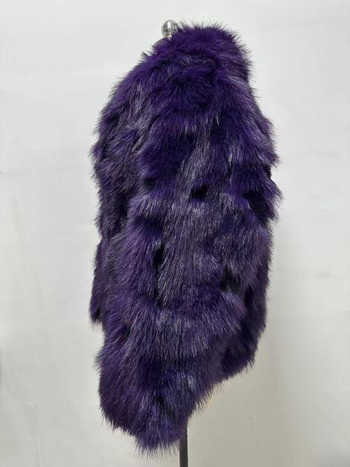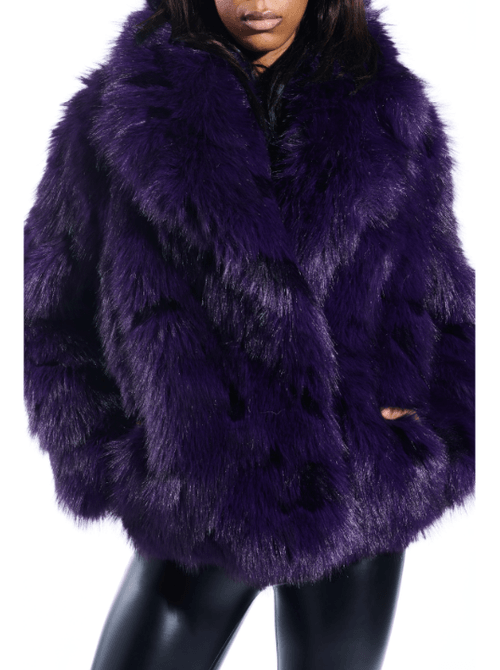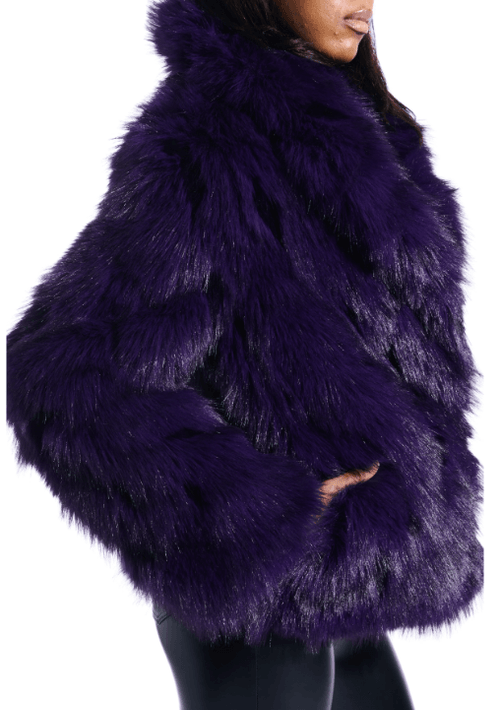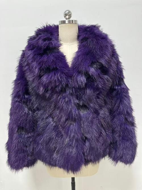 Elegant faux fur coat in a rich purple hue, designed with a turn-down collar and long sleeves. The soft and voluminous texture provides warmth and a luxurious appearance, making it perfect for both casual outings and chic urban looks during autumn and winter.