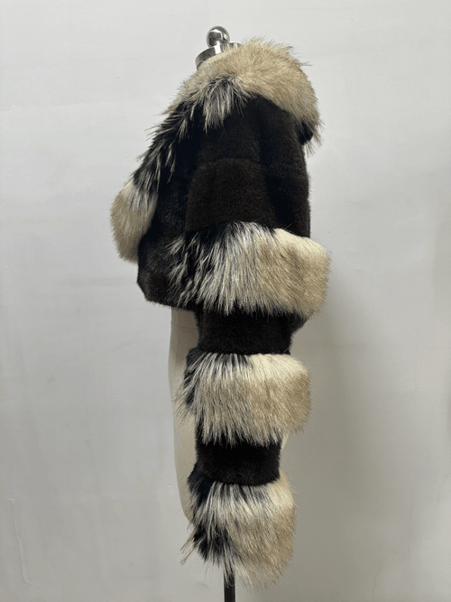 A chic cropped coat crafted from high-quality faux fur, featuring bold patchwork patterns for a modern urban look. Designed with a wide lapel collar and long sleeves, this jacket combines warmth with standout style. Its super-short cut highlights the waistline, making it perfect for layering over slim pants or skirts. Ideal for autumn and winter outings, this fashion-forward piece adds a statement finish to any outfit.