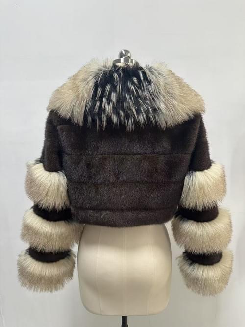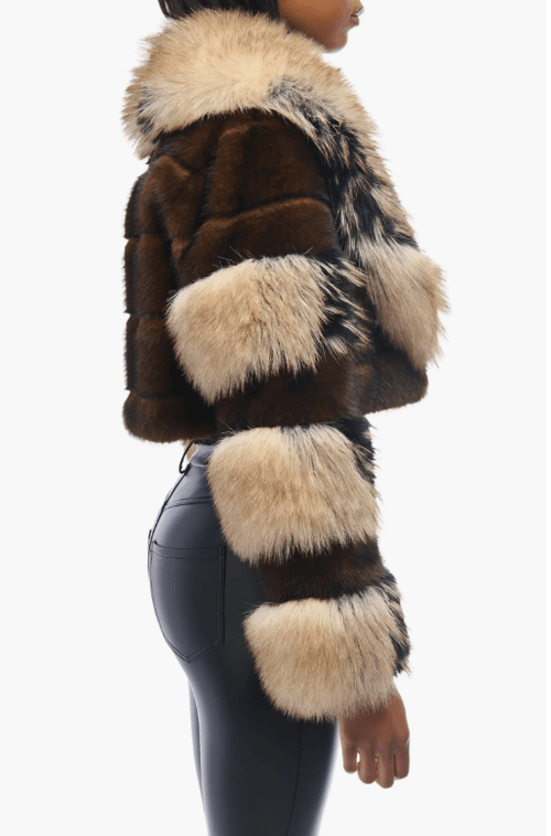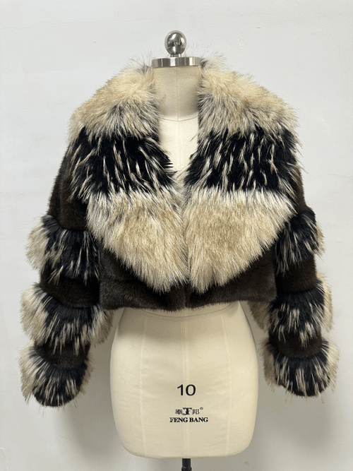 Women’s Faux Fur Patchwork Cropped Coat with Lapel Collar – Brown