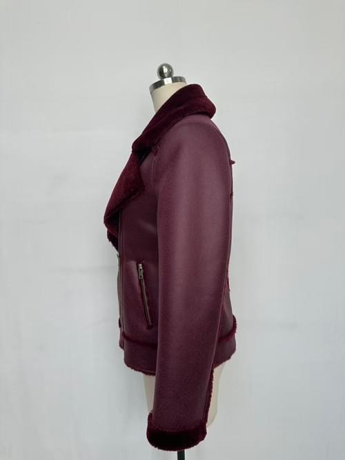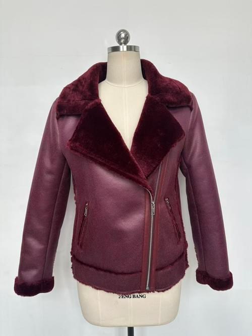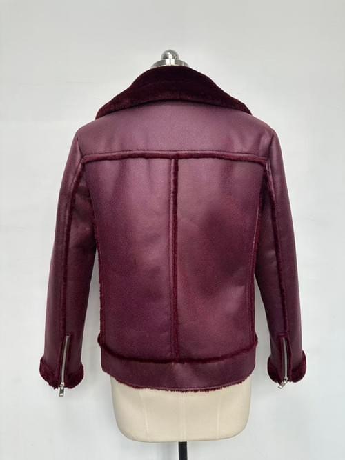 Stylish faux shearling aviator jacket crafted from premium PU leather with soft faux fur lining for extra warmth and comfort. Featuring a classic lapel collar, zip-up front, and tailored cut that creates a chic vintage-inspired look. The wine red tone adds sophistication, making it perfect for autumn and winter wear.