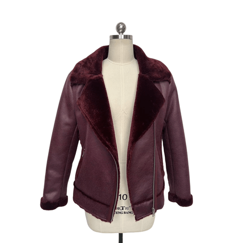 Women’s Faux Shearling Aviator Jacket with Lapel Collar – Wine Red