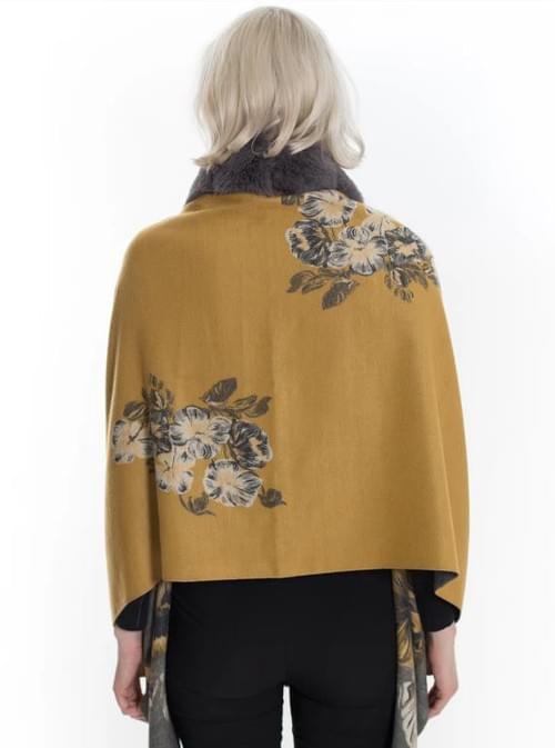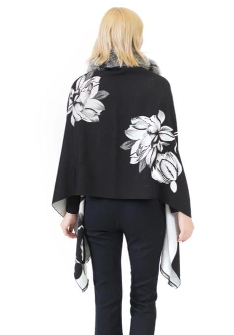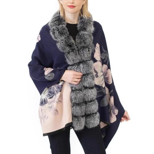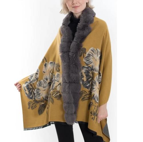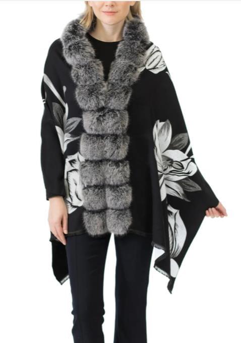 Women’s Floral Jacquard Wool Blend Shawl with Faux Fox Fur Trim