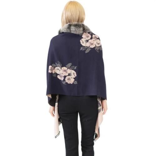 This elegant jacquard wool blend shawl is designed with a floral motif and trimmed with plush faux fox fur along the collar, adding warmth and sophistication. The soft and breathable wool blend fabric provides comfort, while the oversized cut makes it perfect for layering in autumn and winter. Versatile and stylish, this shawl can be worn indoors or outdoors, elevating both casual and formal looks.