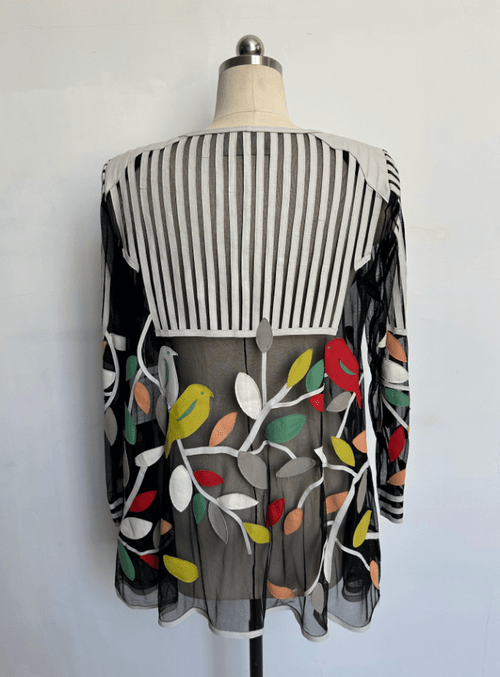 Elegant women’s mid-length jacket made from genuine sheepskin with a floral garden print. Designed with long sleeves, no collar, and a lightweight, breathable style. Perfect for spring wear with a touch of urban fashion.