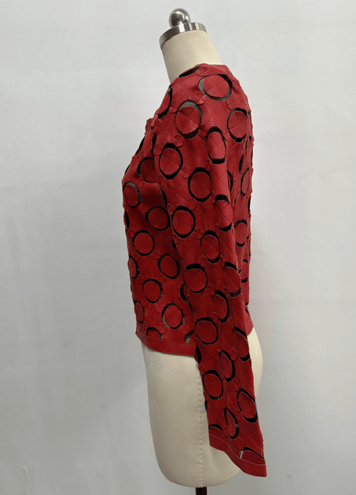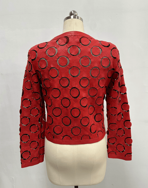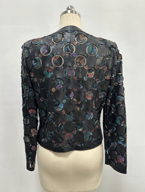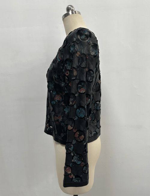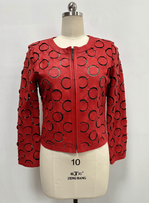 Chic women’s leather jacket made of real sheepskin, featuring a short length and a classic round neckline. The mesh silk paneling and slim-fit design create a stylish urban look, perfect for both casual outings and evening occasions. Available in floral black and red, this jacket combines modern elegance with timeless craftsmanship.