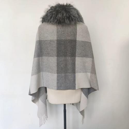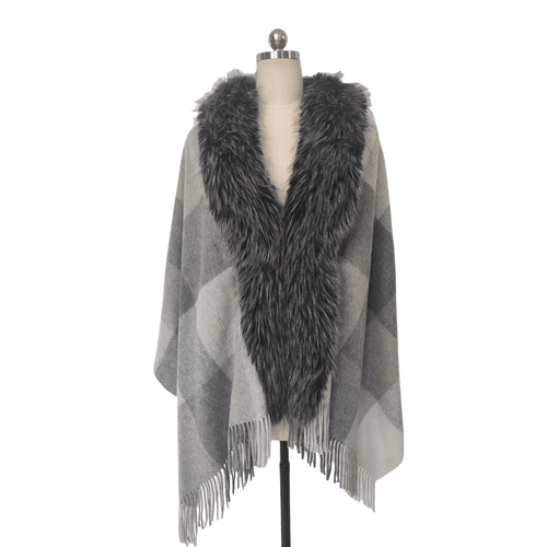 Women’s Plaid Wool Blend Poncho with Faux Fur Collar – Gray