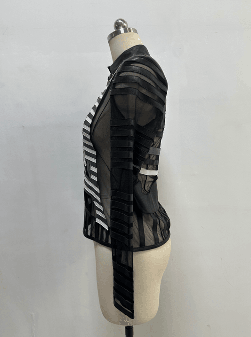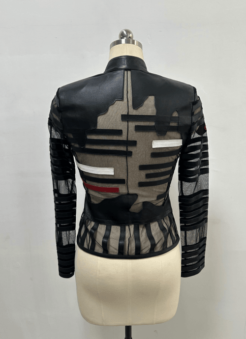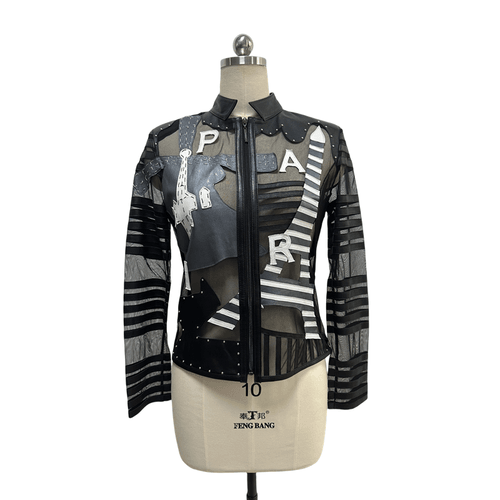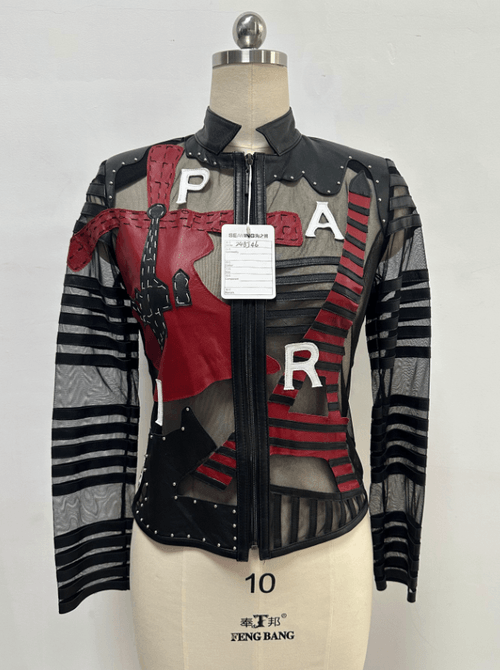 Trendy spring/summer women’s jacket crafted from genuine sheepskin with mesh and silk patchwork details. Featuring a slim fit cut, stand collar, and stylish Eiffel Tower motif, this jacket delivers both sophistication and modern urban flair. Perfect for fashion-forward women looking for a lightweight yet chic outerwear option.